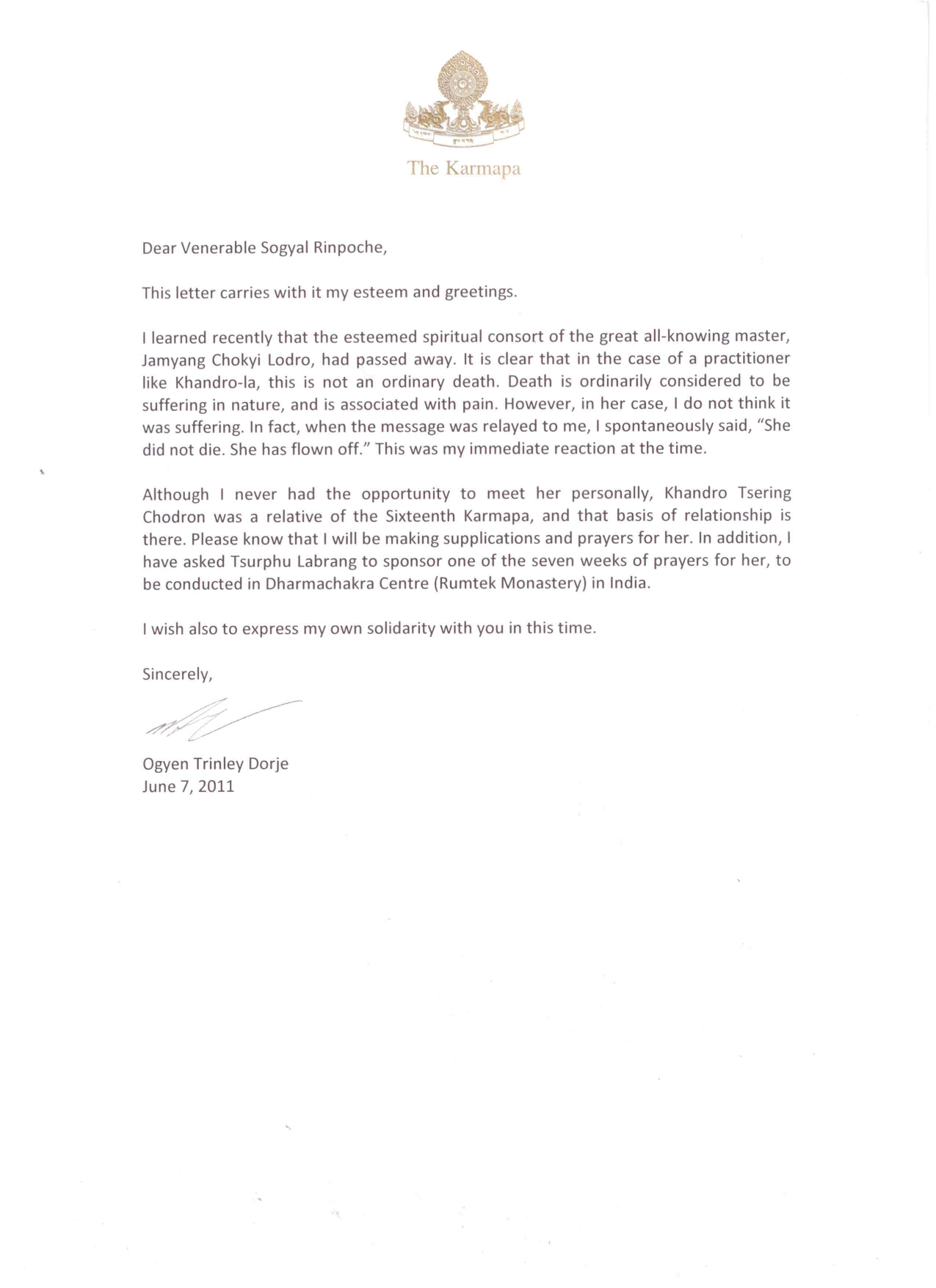 Very kind words of HH 17the Karmapa. I also feel like this…and also want to express my sincere solidarity with Rinpoche and Ma- yumla…for this great loss of such a beloved familymember is not easy to deal with… even though remembering Khandro-la will always warm our heart and calm and clear our mind…With gratitude and prayers, and much love, Marlou van Hoorn, Holland
